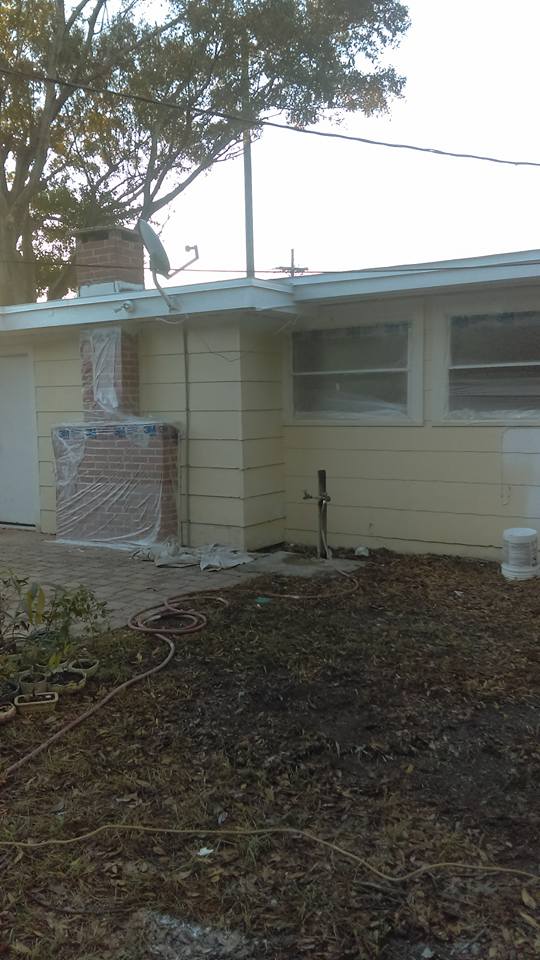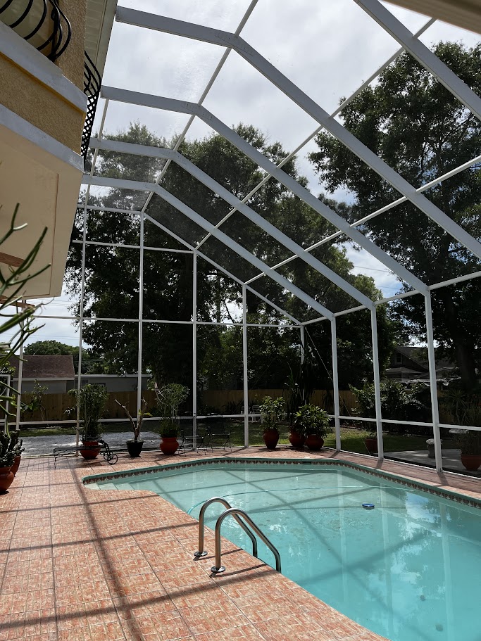 These photos showcase our core services, including driveway cleaning, pool cage restoration, and exterior painting.